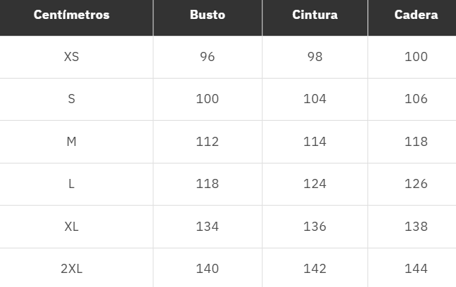 "Las medidas indicadas corresponden a las prendas, no al cuerpo. Para elegir tu talle, te recomendamos medir una prenda que te quede bien (de costura a costura en la parte más ancha) y comparar esa medida con nuestra tabla para encontrar el talle correcto."