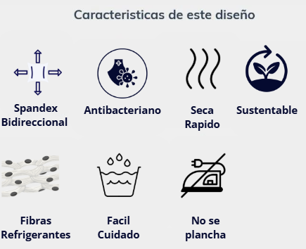 El contenido de la tela es 50% Poliéster /43% Poliéster reciclado /7% Spandex con elasticidad cuatridireccional que presenta propiedades de absorción de la humedad con liberación de suciedad y que no se arruga.